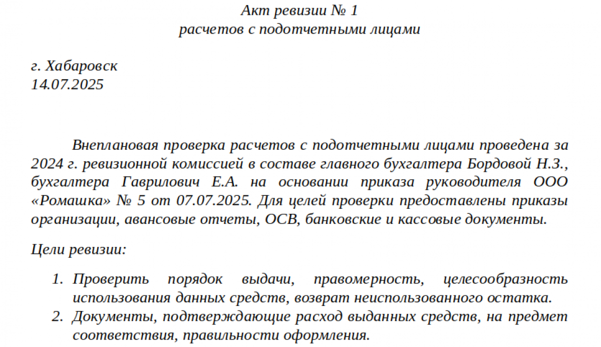 Внеплановая проверка расчетов с подотчетными лицами проведена за 2024 г. ревизионной комиссией в составе главного бухгалтера Бордовой Н. З., бухгалтера Гаврилович Е. А. на основании приказа руководителя ООО «Ромашка» № 5 от 07.07.2025. Для целей проверки предоставлены приказы организации, авансовые отчеты, ОСВ, банковские и кассовые документы.