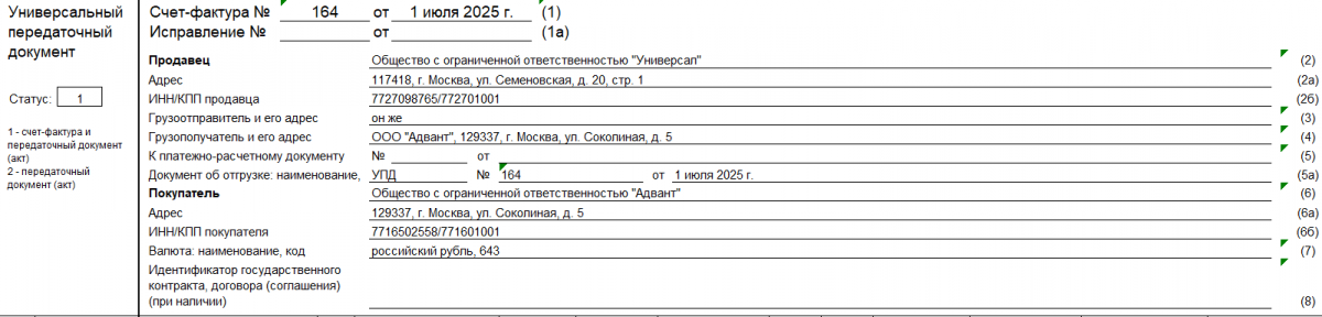 ИП, юрлица на УСН, которые с 2025 г. платят НДС по ставке 5 %, могут использовать форму УПД в общем порядке. Поскольку они являются плательщиками НДС и должны выставлять счет-фактуру, то им нужно заполнять вариант УПД со статусом «1». Он включает обычный счет-фактуру и передаточный акт, который заполняется по одинаковым правилам во всех случаях, вне зависимости от указанного статуса.