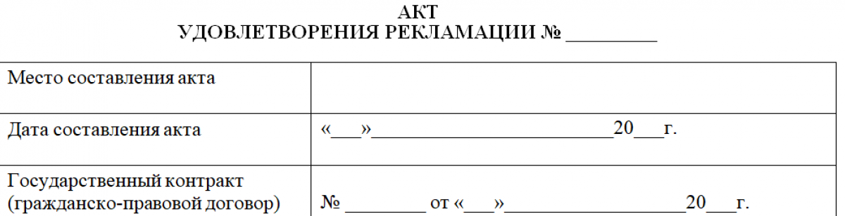 В случае предъявления покупателем рекламации поставщик вправе удовлетворить ее или отказать в удовлетворении, если сочтет заявленные претензии необоснованными. При согласии с требованиями покупателя поставщик составляет акт удовлетворения рекламации. Образец такого акта скачайте ниже бесплатно.