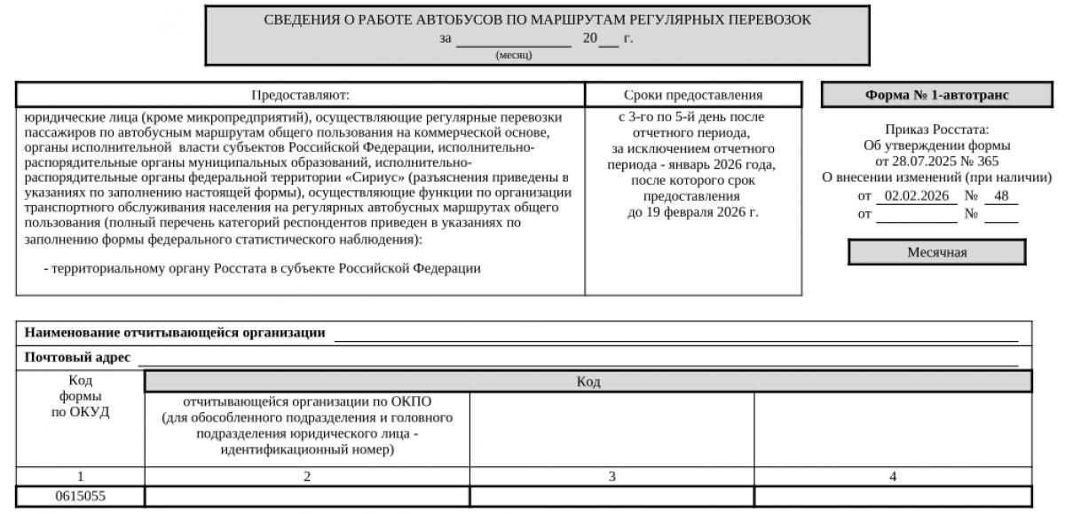 Отметим, что за январь 2026 г. новую форму статотчета 1-автотранс нужно было сдать с 03.02.2026, но не позже 19.02.2026 (приказ Росстата от от 02.02.2026 № 48).