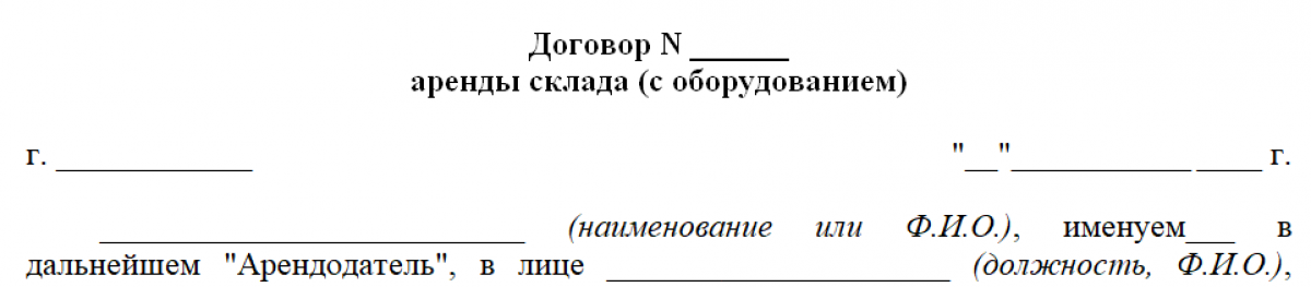 Типового утвержденного бланка договора аренды склада нет. Он оформляется в произвольной форме с обязательным указанием всех существенных условий. Примерная структура договора аренды складского помещения:
