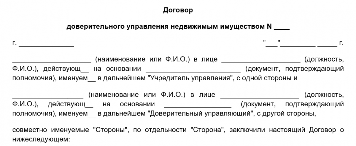 Когда в доверительное управление передают недвижимость, договор доверительного управления имуществом заключается в той же форме, что и при продаже недвижимости. Учредитель управления и управляющий составляют один документ и подписывают его.