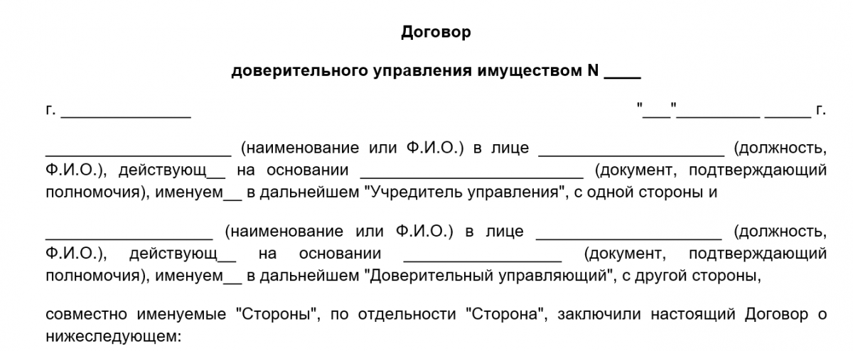 Здесь стороны пишут все, о чем договорились – от предмета договора, вида имущества, которое передают в доверительное управление, до условий об ответственности и урегулировании споров.