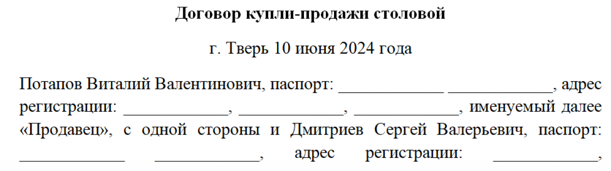 Обязательной для применения формы договора купли-продажи кафе нет. Его составляют произвольно с учетом существенных пунктов, без которых он может быть признана незаключенным. Участники вправе согласовать любые иные, необходимые, по их мнению, условия. Примерная структура договора: