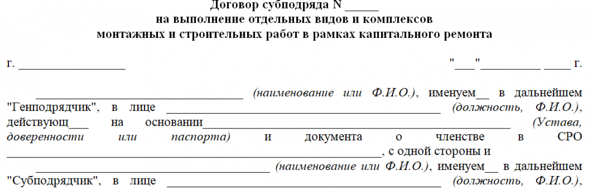 Договор субподряда на капитальный ремонт