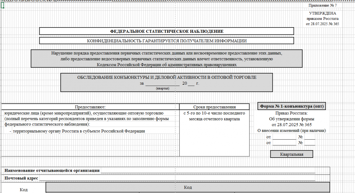 В 2026 г. следует заполнять и сдавать новую версию 1-конъюнктура, опт (ОКУД 0607002) она утверждена приказом Росстата от 28 июля 2025 года №365). Для 1-конъюнктура (опт) сроки сдачи устанавливает Росстат. На 2026 г. это 5–10-е число последнего месяца отчетного квартала.