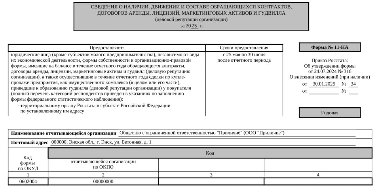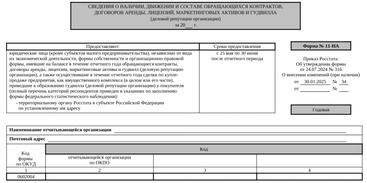 Форму № 11-НА заполняют юридические лица всех видов деятельности и форм собственности за исключением компаний, относящихся к субъектам малого предпринимательства. На отправку отчета Росстат отводит 37 дней: с 25 мая по 30 июня. Представлять форму нужно по итогам отчетного года.