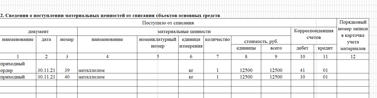 Дт 91.2 Кт 41 – 12 500,00 списана стоимость металлолома.