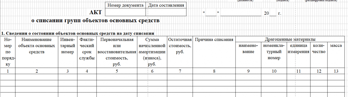 На основании решения о списании ОС издается приказ произвольной формы, который является основанием для составления актов по форме:
