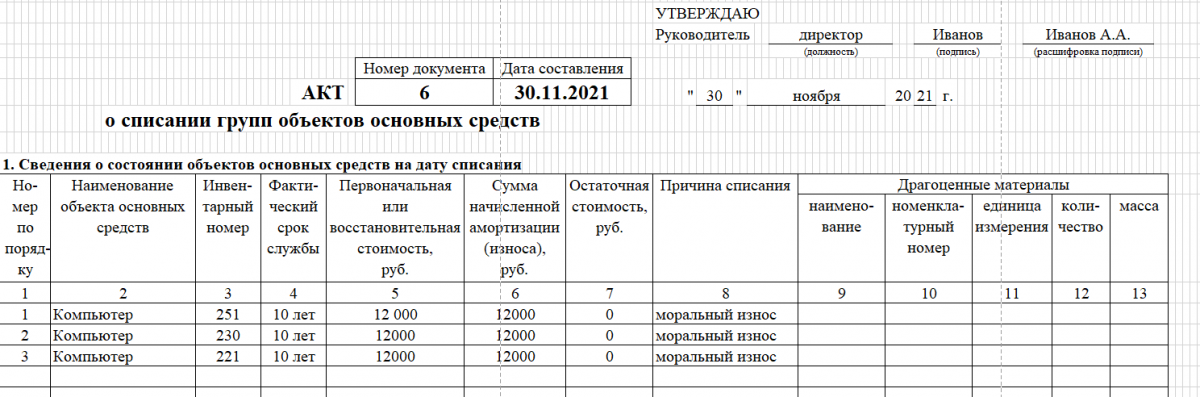 Пример: списание ОС и акт списания основных средств ОС-4б в ООО «Иван да Марья»