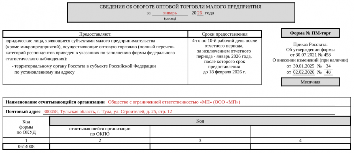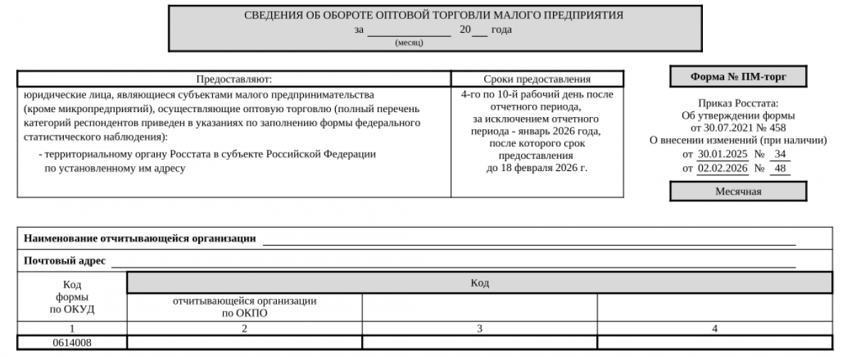 В 2026 г. для заполнения формы ПМ торг применяется бланк, утвержденный приказом Росстата от 30.07.2021 № 458 (в ред. от 20.02.2026). Он доступен для скачивания на нашем портале.