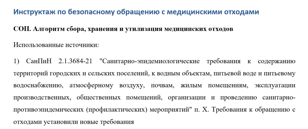 Инструктаж по безопасному обращению с медицинскими отходами представляет собой обучение правилам их сбора, временного хранения и утилизации. Соответствующую инструкцию разрабатывает самостоятельно медицинская организация. Ниже можно бесплатно скачать пример инструктажа.