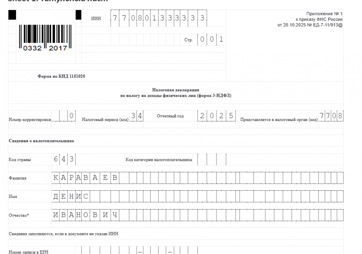 Титульный лист 3-НДФЛ должен содержать следующие сведения: