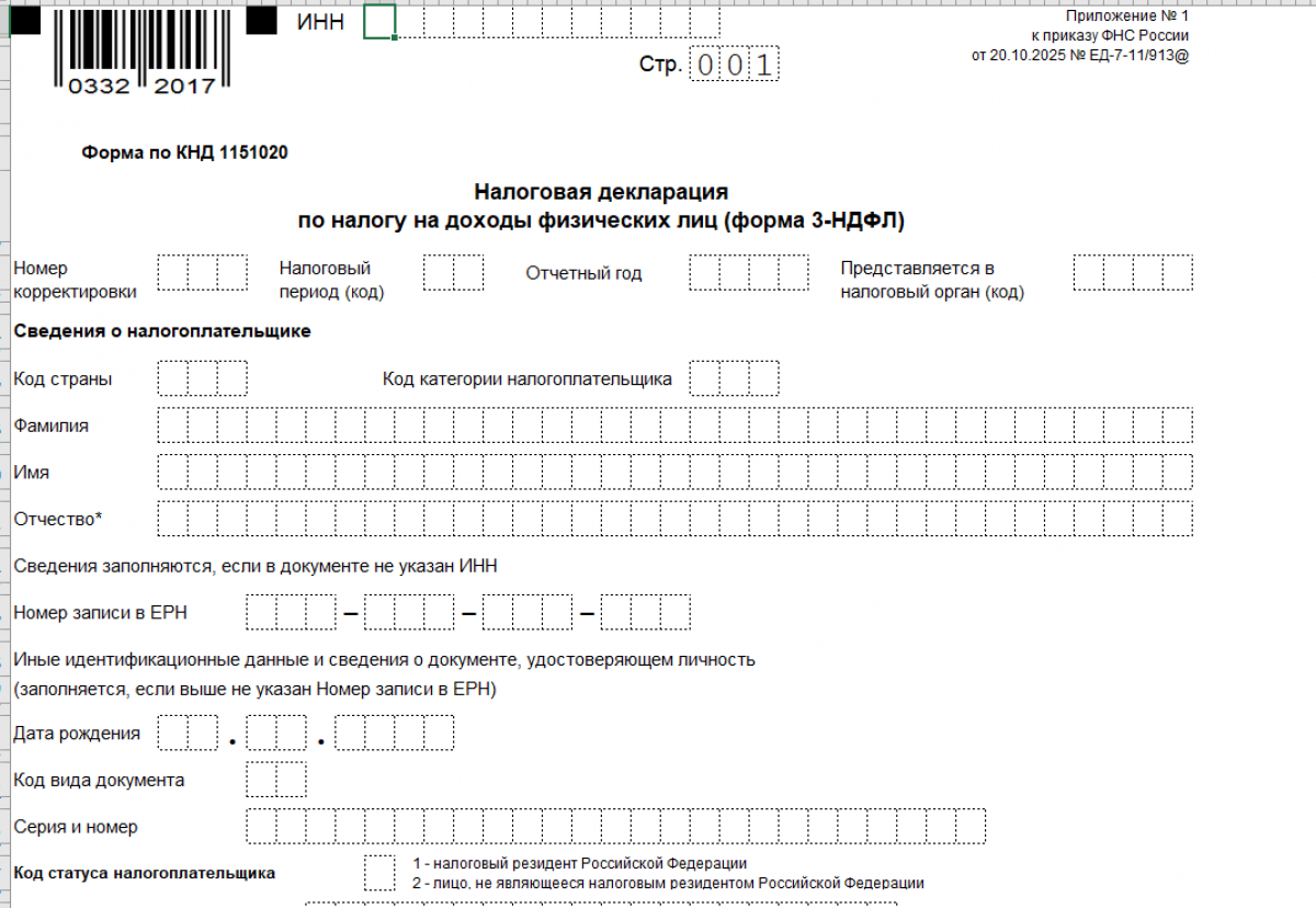 Форма и порядок заполнения декларации утверждены приказом ФНС №ЕД-7-11/913@ от 20.10.2025г.