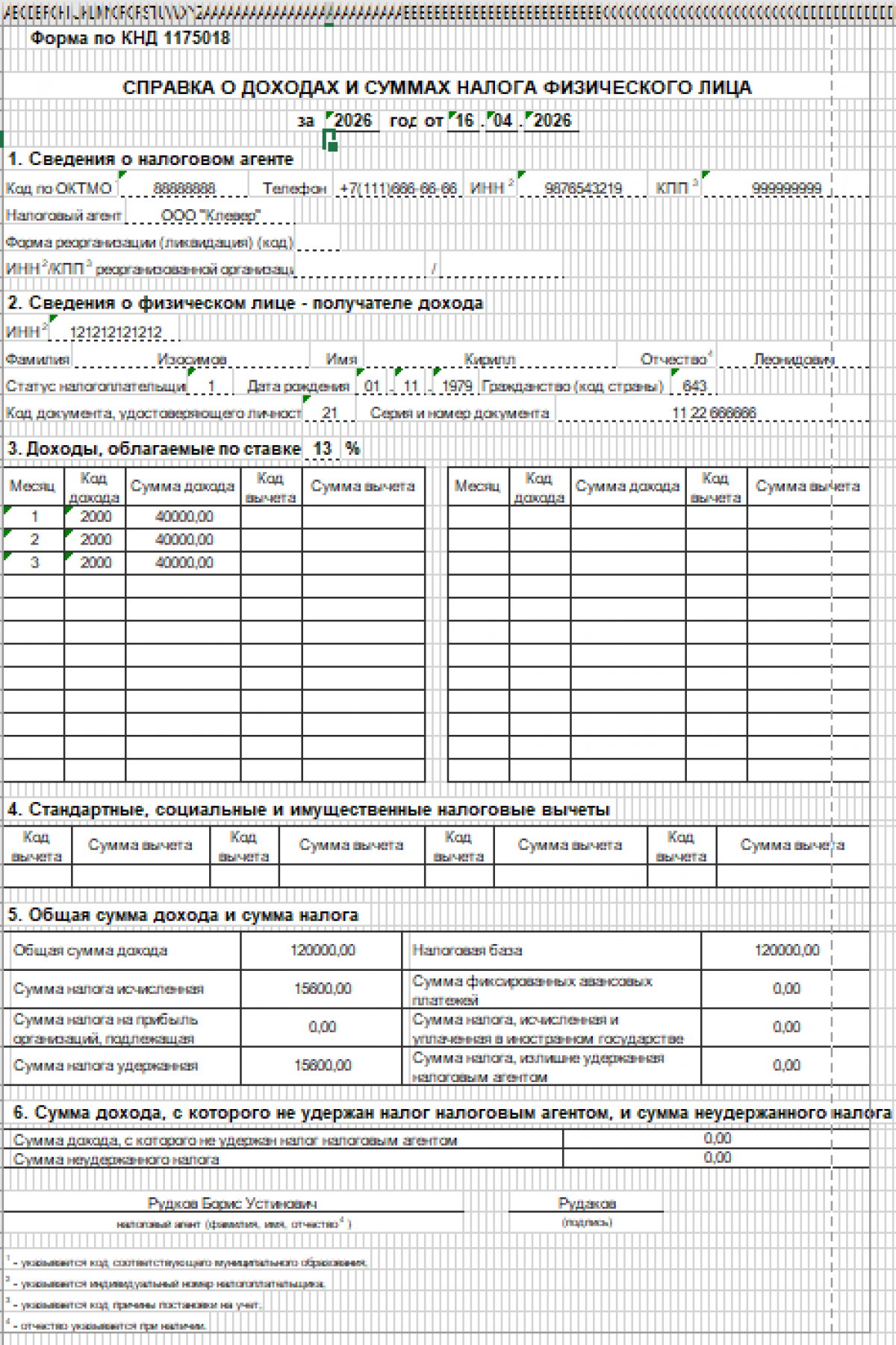 Наниматель (директор Рудаков Борис Устинович, ООО «Клевер») оформляет справку о доходах и удержанном НДФЛ за 2026 г. для сотрудника Изосимова Кирилла Леонидовича. Основание – поданное работником заявление. Дата выдачи – 16.04.2026.