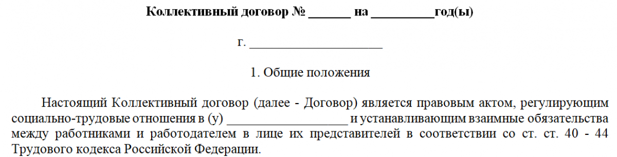 Таким образом, содержание и структура коллективного договора определяются обеими сторонами исходя из вопросов, которые необходимо рассмотреть и зафиксировать в договоре. Стоит помнить, что коллективный договор (образец мы приведем в конце статьи) не должен содержать условия хуже, чем гарантированы работникам трудовым кодексом – если такие условия будут включены, они не будут применяться.