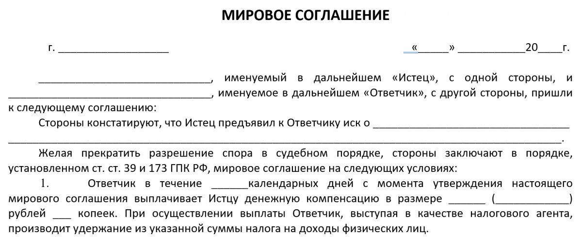 Если в процессе судебного разбирательства по трудовому спору стороны пришли к некоей взаимовыгодной договоренности, они могут оформить мировое соглашение. На основании него суд прекратит судебный процесс. Скачайте ниже бесплатно образец мирового соглашения по трудовому спору.