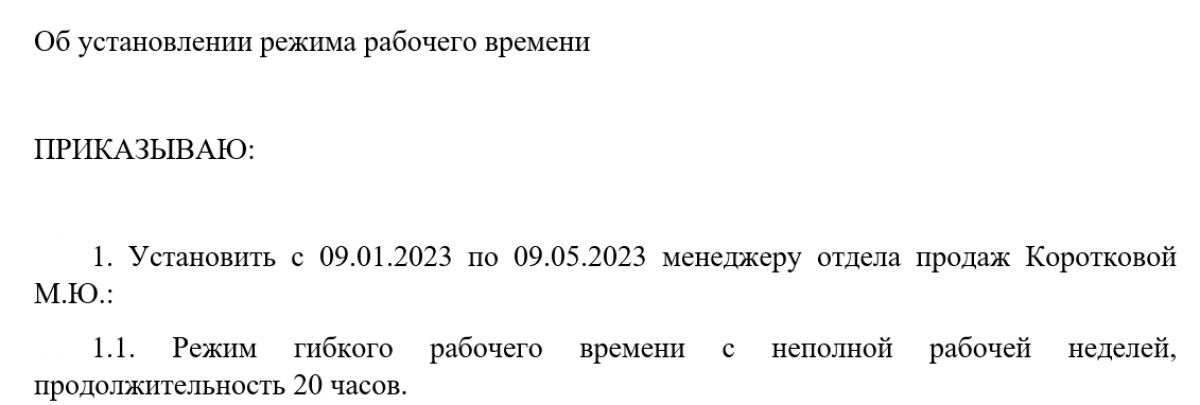 Готовый заполненный образец приказа об установлении гибкого графика работы