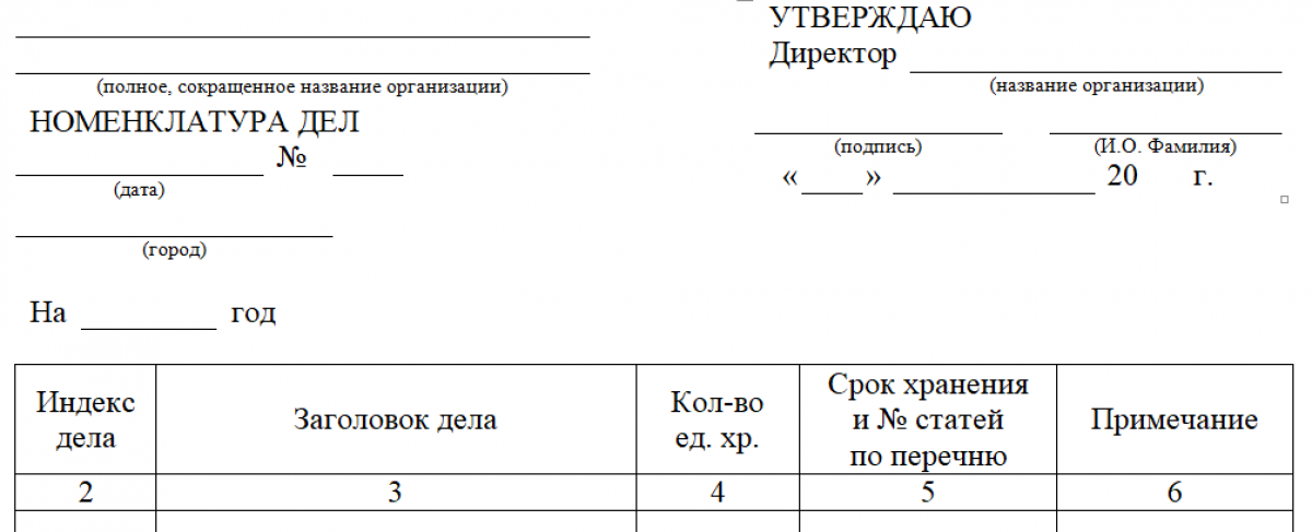 Номенклатура дел составляется на бланке организации. Можно воспользоваться формой, утвержденной Приказом Минкультуры России от 31.03.2015 N 526 (приложение 25).