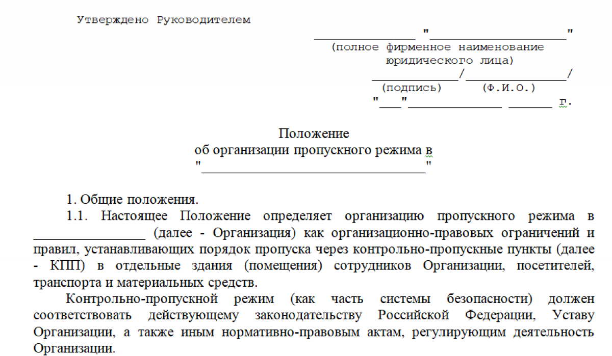 При введении пропускного режима на территорию организации, кроме приказа руководителя, необходимо также разработать и утвердить локальный нормативный акт (обычно положение), где будут подробно описаны особенности прохода и проезда, график посещения и др. Скачайте ниже бесплатно образец положения о пропускном режиме.