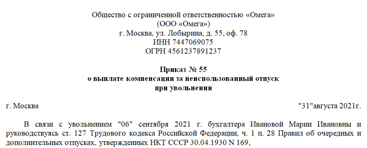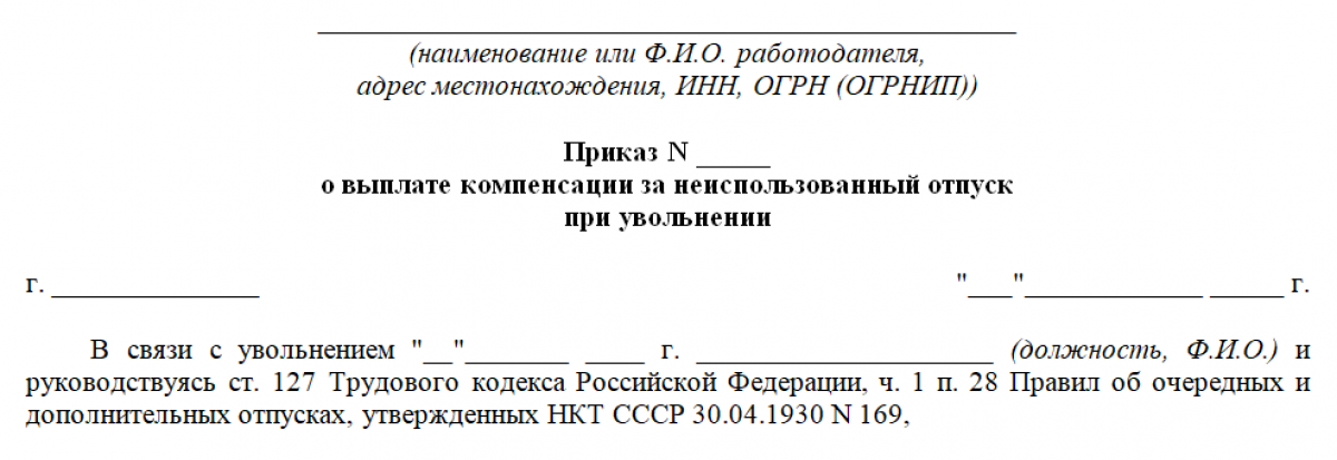 Приказ о выплате компенсации за неиспользованный отпуск не имеет строго установленной формы, поэтому его можно составить в произвольном виде. Главное - правильно укажите дату увольнения - последний день отпуска работника - и сумму причитающейся ему компенсации (ст. 127 ТК РФ).