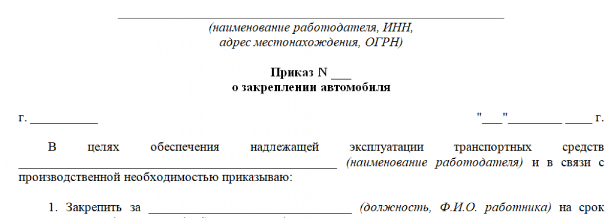 Приказ о закреплении автомобиля за сотрудником (образец)
