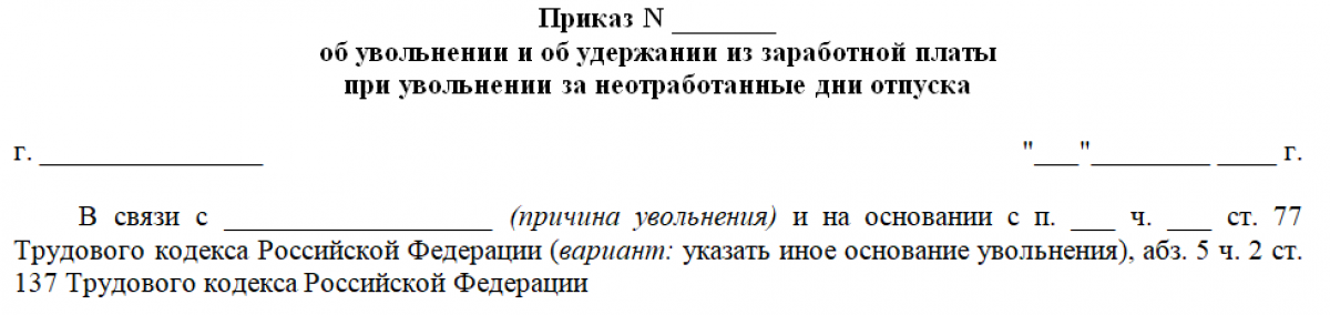Приказ об увольнении работника с удержанием из заработной платы за неотработанные дни отпуска