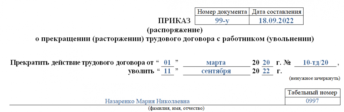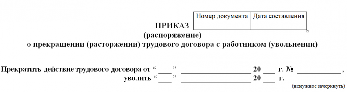 Рекомендуемая форма приказа об увольнении утверждена постановлением Госкомстата России от 05.01.2004 № 1, форма по ОКУД: 0301006, индекс формы: Т-8.