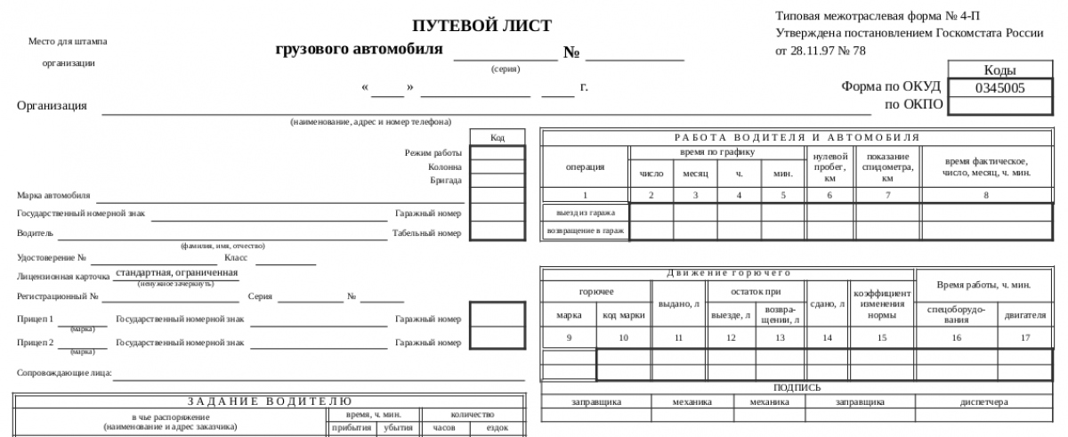 Путевой лист («Газель») – бланк по форме 4-П: