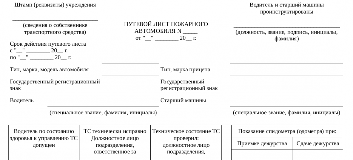 Форма путевого листа пожарного автомобиля