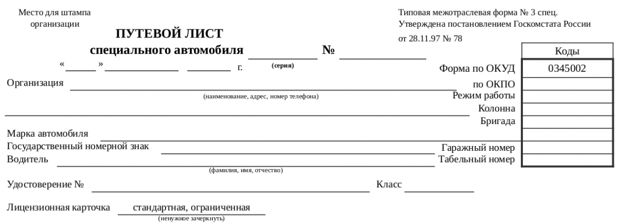 Стандартный путевой лист содержит несколько ключевых блоков: