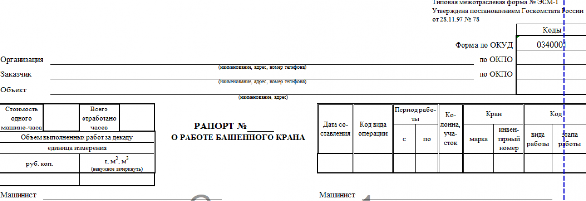 Рапорт по форме ЭСМ-1 используют предприятия для учета рабочих часов сотрудников, занятых на специализированных кранах. Форма рапорта утверждена постановлением Госкомстата РФ от 28.11.1997 № 78. Скачайте ее ниже бесплатно.