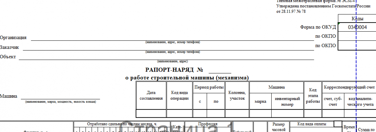 Рапорт-наряд по форме ЭСМ-4 используют работодатели для учета рабочих часов персонала, занятого на строительных механизмах и машинах. Этот документ служит основанием для расчета заработной платы работникам. Рекомендуется использовать форму ЭСМ-4, утвержденную постановлением Госкомстата РФ от 28.11.1997 № 78. Скачайте ее ниже бесплатно.