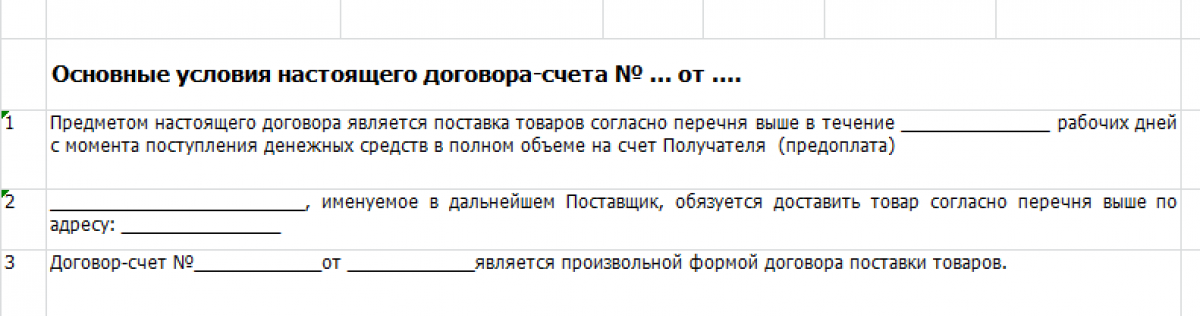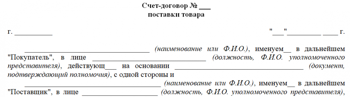 Внизу ставит подписи руководитель и главный бухгалтер. Также счет-договор может быть составлен как двусторонний документ с условием об оплате в течение определенного срока после подписания. В договоре допустимо обговорить срок после оплаты, в течение которого будет поставлен товар.