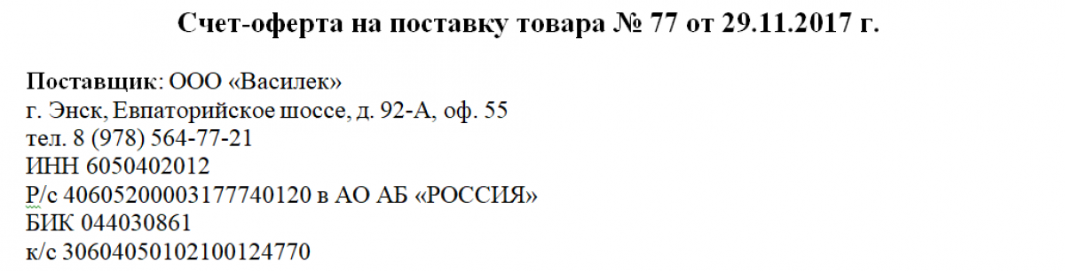 Счет-договор или счет-оферта совмещает в себе функции счета на оплату и договора. Он удобен для разовых сделок на небольшие суммы, когда отсутствует необходимость согласования большого объема специфических условий. В его текст также включают все значимые с точки зрения участников условия. Это наименование и количество товара, цена, сроки и порядок оплаты, идентификационные данные компании выставляющей документ. Также в нем обязательно присутствуют платежные реквизиты.