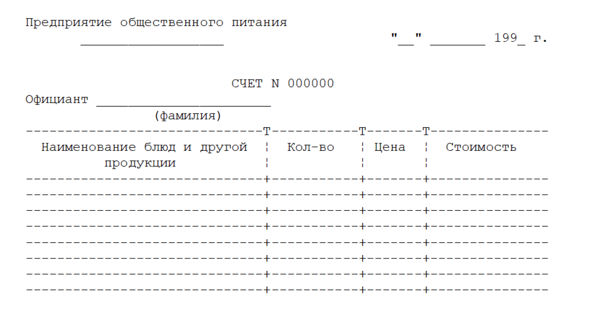 Форма счета в кафе строго не регламентирована. Обычно в него включают следующую информацию: наименование блюд, их количество, цену, общую сумму заказа, фамилию официанта. Скачайте ниже бесплатно бланк счета в кафе.