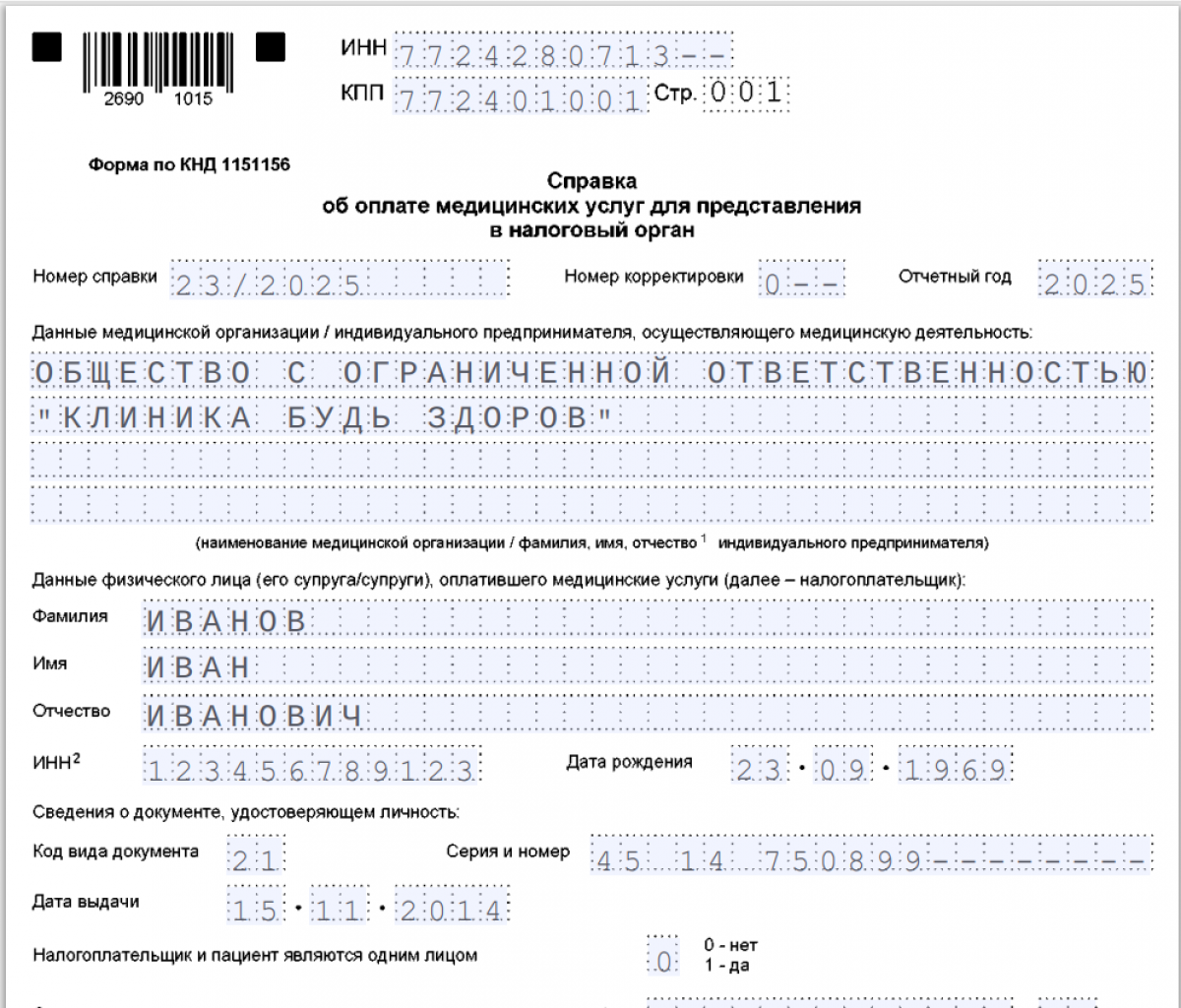 Справка для налогового вычета за медицинские услуги - образец 2026