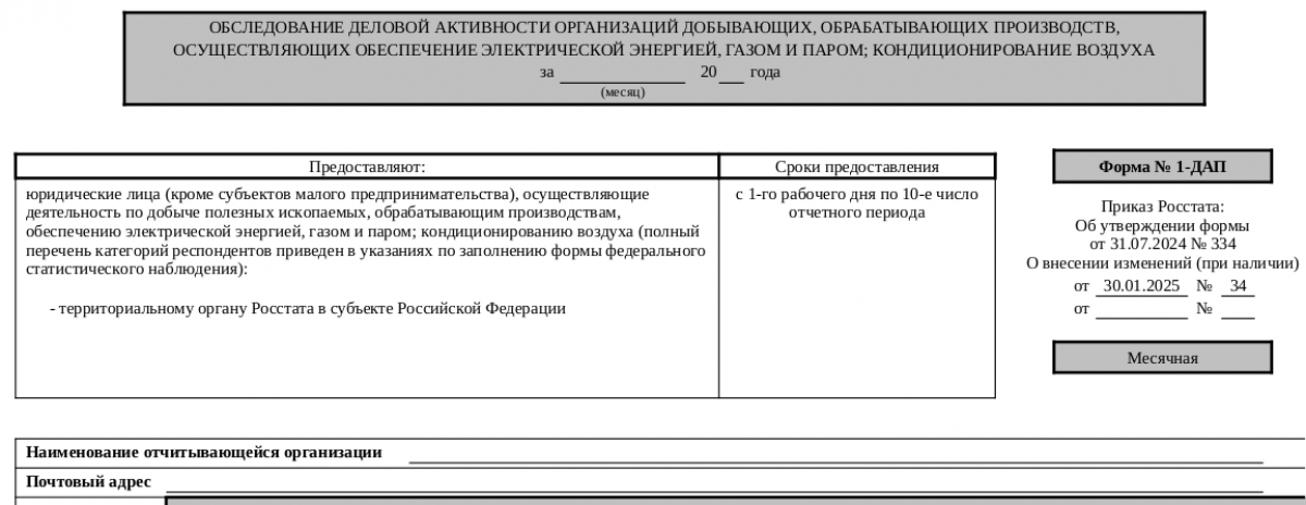 Порядок заполнения статистической формы 1-ДАП регламентирован приказом Росстата № 334 от 31.07.2024 (в редакции от 30.01.2025). В этом же документе можно найти и скачать бланк отчета.