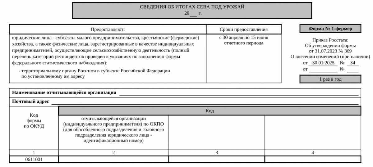 Срок предоставления отчета 1-фермер зависит от того, когда окончился посев яровых культур, но не ранее 30-го апреля и не позднее установленного дня в бланке отчета.
