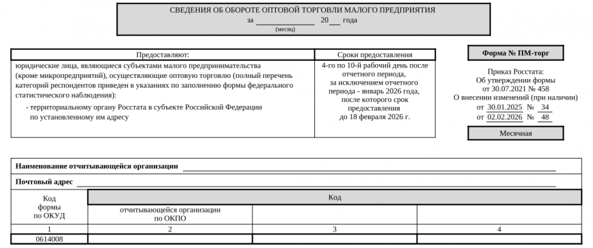 Форма ПМ-ТОРГ входит в список ежемесячной отчетности. Она подается в орган статистистки в период с 4-го по 10-й рабочий (!) день месяца, следующего за отчетным (исключение - срок сдачи отчета за январь 2026 года установлен на 18 февраля):