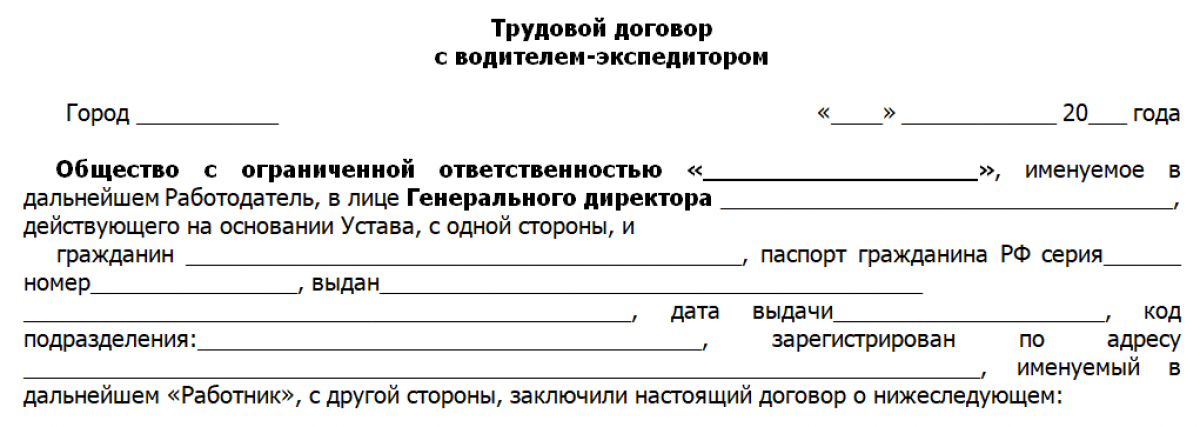 Обязательного формата договора нет, его составляют произвольно с учетом требований к содержанию и специфики занятости конкретного работника. Список реквизитов трудового договора с водителем-экспедитором:
