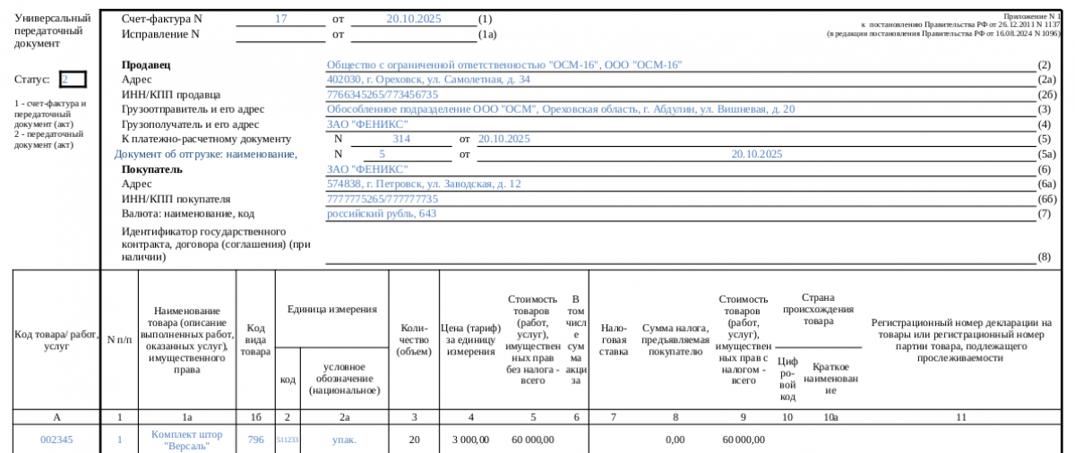 Бланк по теме: Форма УПД: образец заполнения 2025Реквизиты УПД можно видоизменять и дополнять в соответствии с особенностями работы субъекта хозяйствования, только факт этот необходимо закрепить в учетной политике компании.