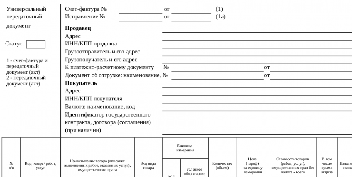 При заполнении документа также важно поставить правильное значение в поле «Статус». Цифра «1» показывает, что УПД используется вместо акта и счета-фактуры одновременно. Если же документ нужен только для подтверждения факта выполнения работы, без функции счета-фактуры, то ставится «2».