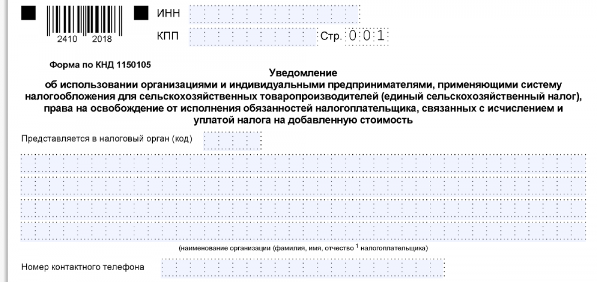 - КНД 1150105 − уведомление об освобождении от НДС для плательщиков ЕСХН;