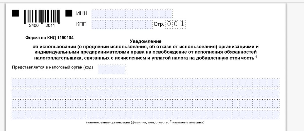 - КНД 1150104 − уведомление об освобождении от НДС (за исключением плательщиков, применяющих ЕСХН);