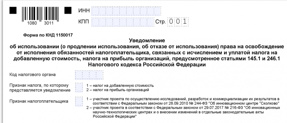 Из этих правил есть исключение. В некоторых случаях для уведомления о продлении используется бланк первичного уведомления. К примеру, участники проекта Сколково в уведомлении для продления освобождения от НДС, оформляемом на бланке формы 1150017, в поле «Сообщаю» должны проставить код «2». При этом среди подтверждающих бумаг, кроме документов, подтверждающих статус участника проекта, должен присутствовать отчет о финансовых результатах, а в некоторых случаях и некоторые дополнительные расчеты.
