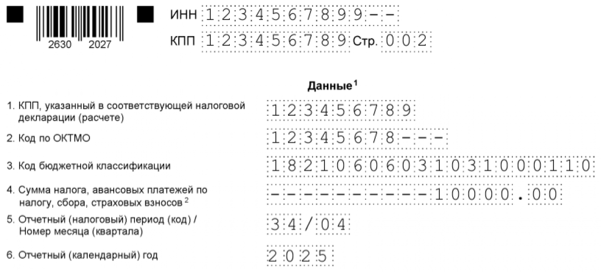 Раздел «Данные» заполняют блоками. В каждом из них указывают соответствующий КПП и ОКТМО (территории, на которой находится участок), КБК для земельного налога, сумму к уплате, период и календарный год (так, как указано сверху в таблице). Тут же записывают код периода, для итогового платежа за год это 34/04 (налоговый период / квартал). Календарный год - 2025.