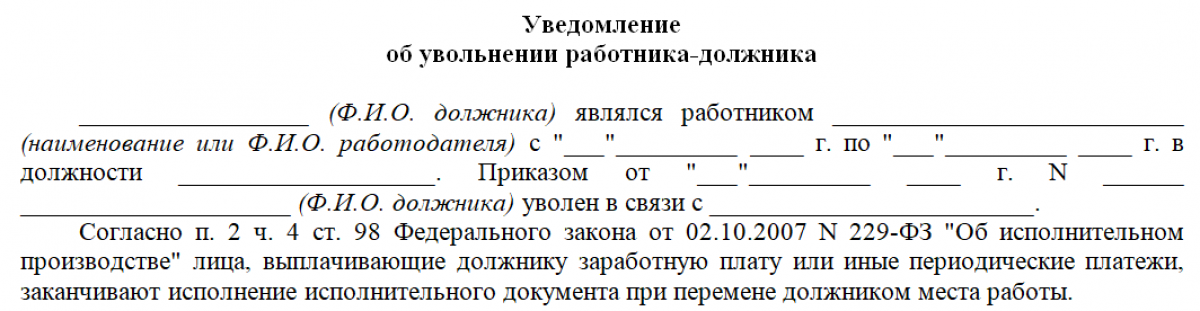 текстовую часть с информацией о факте увольнения работника-должника и основания для увольнения, реквизитов исполнительного листа, на основании которого осуществлялись удержания;