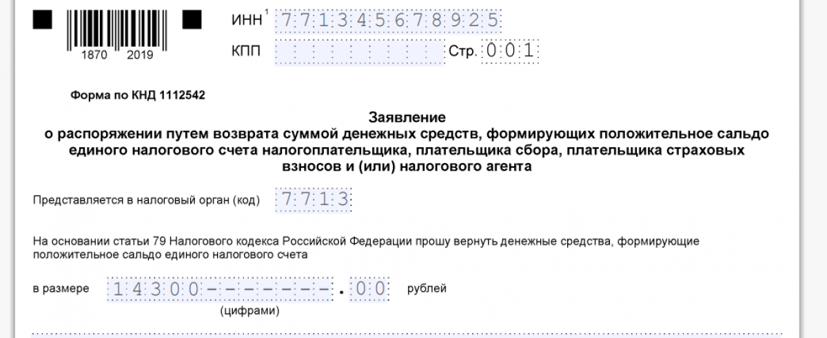 В первом случае надо заполнить специальное заявление, которое размещено в самой декларации – в приложении к ее разделу 1. Название этого заявления такое: "Заявление о распоряжении путем возврата сумм денежных средств, формирующих положительное сальдо единого налогового счета".