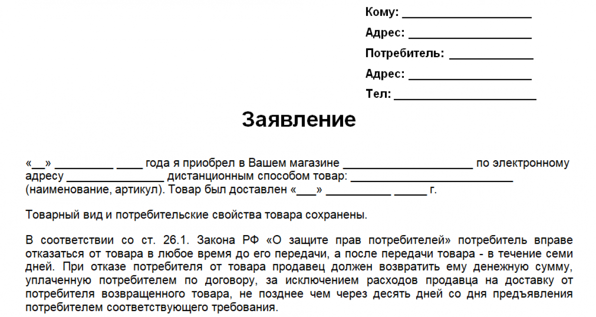 Заявление на возврат товара в интернет-магазин